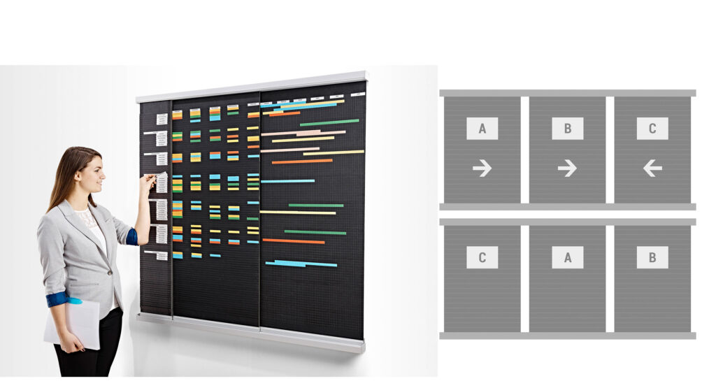 Professionelle Planungstafeln sind in unterschiedlichsten Formaten erhältlich, um den unterschiedlichen Bedürfnissen unserer Kunden gerecht zu werden. Großformate eignen sich hervorragend für die Darstellung umfangreicher Projekte oder Schichtpläne in Produktionsstätten und Büros.
